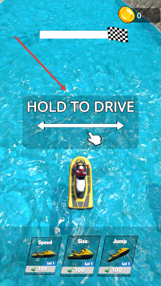 1、长按屏幕【HOLD TO DRIVE】区域,控制黄色摩托艇启动,开启水上竞速挑战。