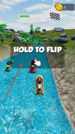 2、比赛时,长按【HOLD TO FLIP】区域,让摩托艇空翻,躲避对手并实现超越。