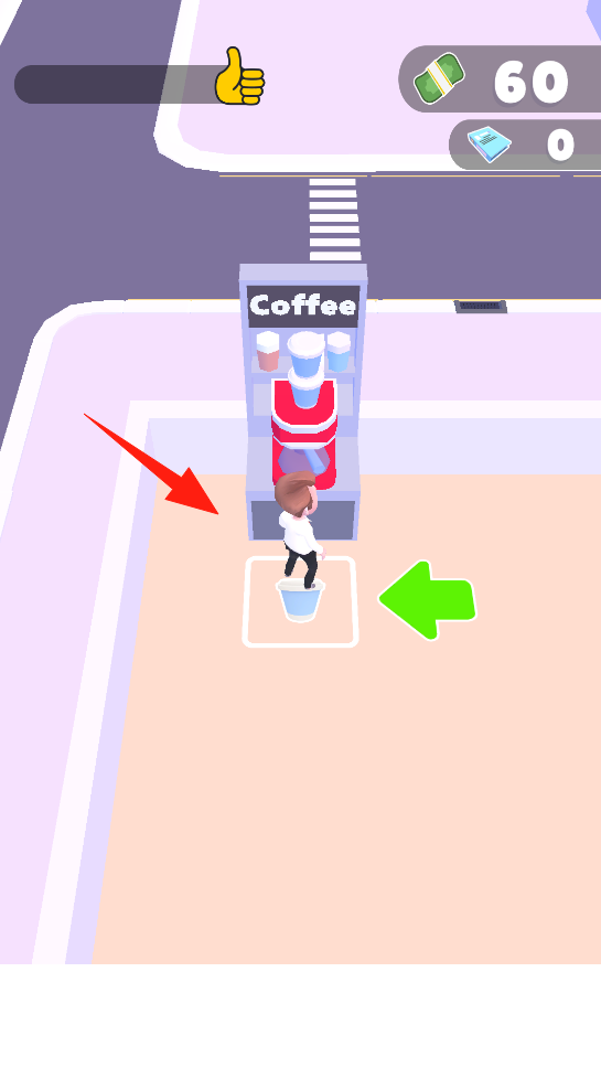 2、角色来到咖啡机旁,按照绿色箭头指引,将杯子放置指定区域,获取咖啡,借互动指引机制,完成场景任务,体验模拟办公生活的日常环节,感受与场景物品交互的趣味。