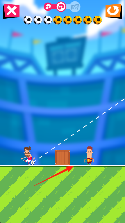 3、关卡出现木箱等新障碍,按箭头指引规划射门路线,借助反弹、碰撞,突破阻碍,完成射门。