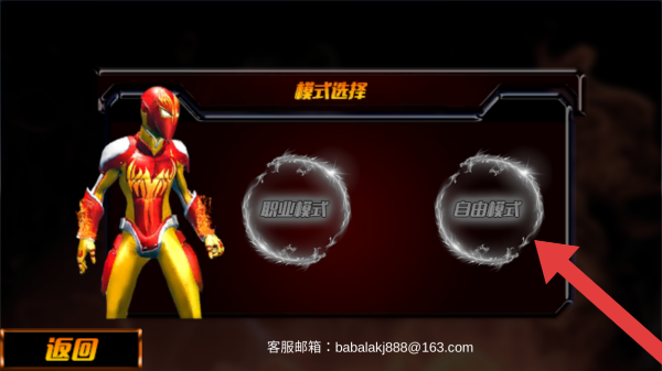 2、这是《超级钢铁英雄》的模式选择界面,有“职业模式”和“自由模式”两个选项,左下角有“返回”按钮,角色为身着黄红战斗服的超级英雄形象。