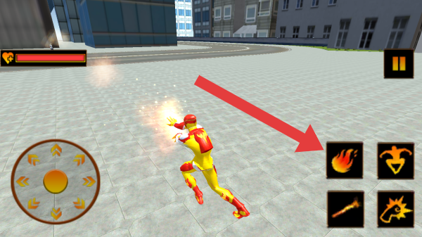 3、展示了超级英雄角色,身着黄红配色战斗服,正在城市场景中战斗,界面有方向控制轮盘、技能图标(火焰等样式)以及暂停按钮。
