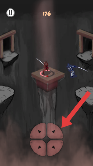 2、游戏中玩家操控红色火柴人角色战斗,画面上方显示暂停按钮和分数176,红箭头所指的四方向按键用于操控角色移动。