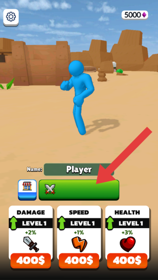 1、画面中蓝色火柴人角色下方是角色属性升级界面,有伤害、速度、生命值三个属性,当前均为1级,升级对应属性分别需400货币,还可对角色进行命名。