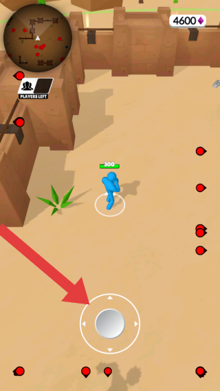 3、呈现沙漠场景中,蓝色玩家火柴人正与其他火柴人战斗,左上角小地图、剩余货币(4600)及武器、摇杆等界面元素,展现其大逃杀对战玩法。