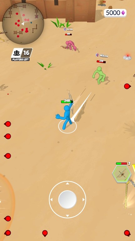 2、蓝色火柴人角色身处沙漠风格场景,画面左上角是小地图,显示敌人位置等信息,“ENEMIESLEFT”表示剩余敌人数量。