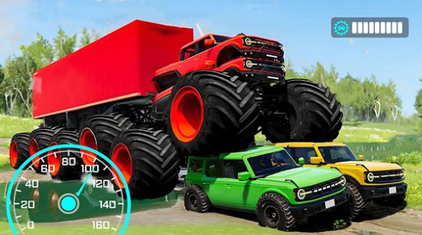 1、多地形驾驶挑战:在沙漠、丛林、山地等多样地形中驾驶怪物卡车,应对不同路况带来的阻力与障碍,考验操控精准度。