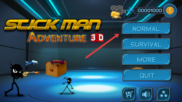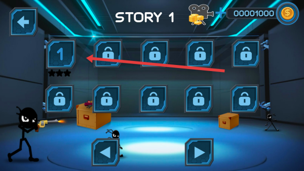 1、在主界面,选【NORMAL】模式,进入“STORY1”,点击关卡“1”,开启火柴人3D冒险之旅。