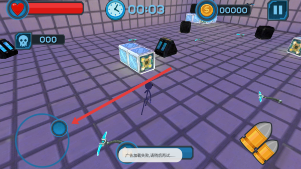 2、进入关卡后,操控虚拟摇杆(左侧蓝色圆圈),移动火柴人,在房间内探索,收集武器(如飞镖)。