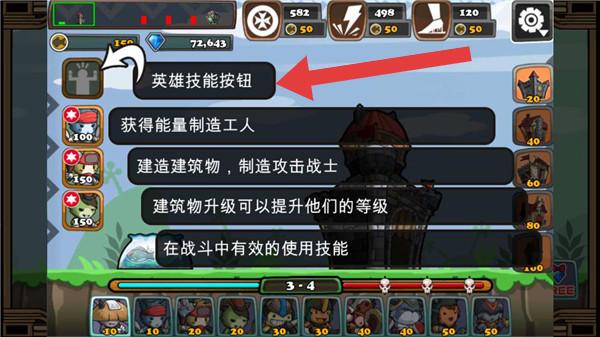 3、战斗中,合理使用技能(如制造工人、升级建筑),按箭头指引操作,抵御敌人,完成“3-4”波次挑战。