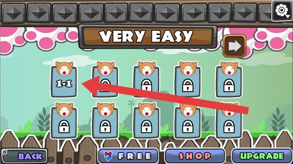 1、点击【TAP-TO-START】,进入《Cat-War》,选择“VERY-EASY”难度的“1-1”关卡,开启猫咪战斗。