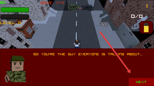 3、对话结束后,点击【NEXT】,继续教程,学习射击、躲避等技巧,为正式关卡(如CITY1)做准备。