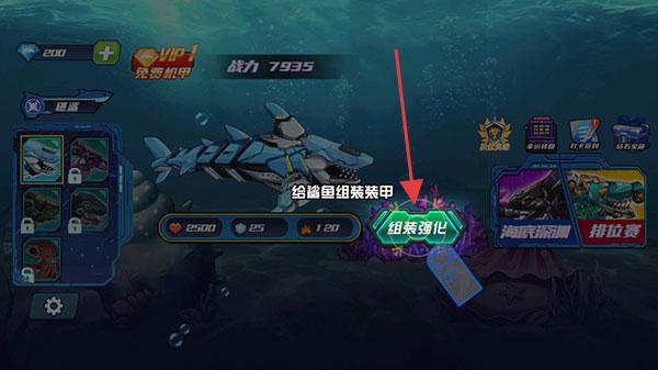 1、进入界面,点击 “组装进化”,拖拽右侧部件(如武器、装甲 )到鲨鱼对应部位,消耗资源(2500 血、25 银币等 )完成机甲装配。