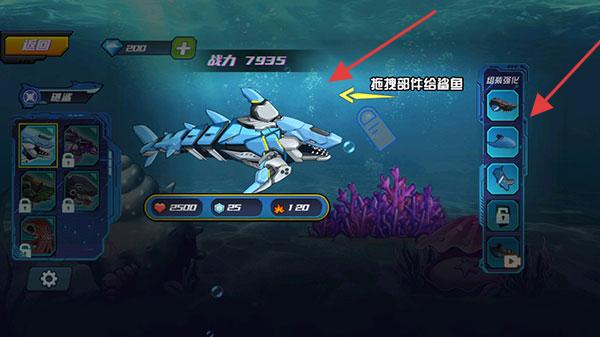 1、机械鲨操控与战斗操作:滑动屏幕控制机械鲨游动方向,点击屏幕触发普通攻击(咬合/撞击),长按技能键释放部件专属技能(如激光炮、电锯旋转),战斗中需观察敌人。