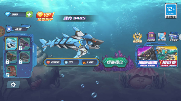 3、沉浸式海底氛围:采用3D建模还原深海环境,机械鲨游动时水流特效随速度变化(高速移动带起气泡尾迹),战斗中零件碰撞迸发火花与金属碎屑,搭配低沉的机械运转。