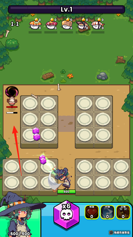 1、进入Lv.1关卡,观察箭头指向的怪物路径,操控角色,利用技能清理初始寿司怪。