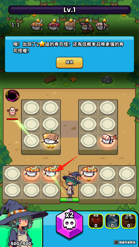 2、击败基础怪后,触发2星寿司怪召唤,点击“继续”,在箭头位置布置或强化己方单位。