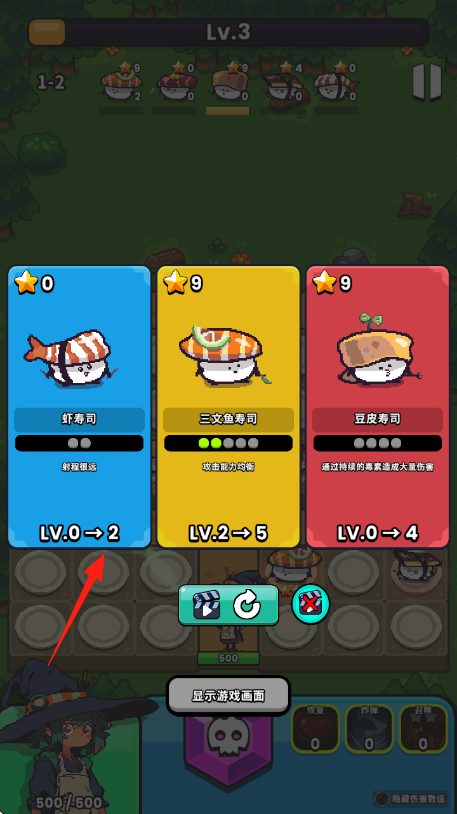 3、到Lv.3,在角色界面,按箭头提示升级“虾寿司”等单位,提升战力,应对更强关卡。