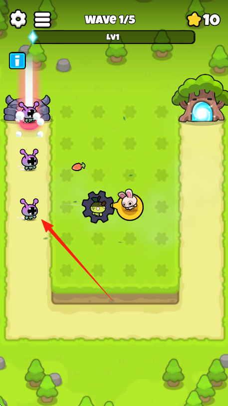 2、Wave1来袭,观察箭头指向的紫色敌人,依靠已布置防御攻击,若压力大,升级防御。