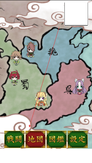 2、主界面通过【戦闘】(战斗)推进剧情,【地図】(地图)探索魏蜀吴据点,【図鑑】(图鉴)查看收集角色。