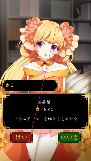 3、遇购物界面(如购买“ビキニアーマ”),若金币(0)不足,优先战斗赚金币;金币够时选【はい】购买。