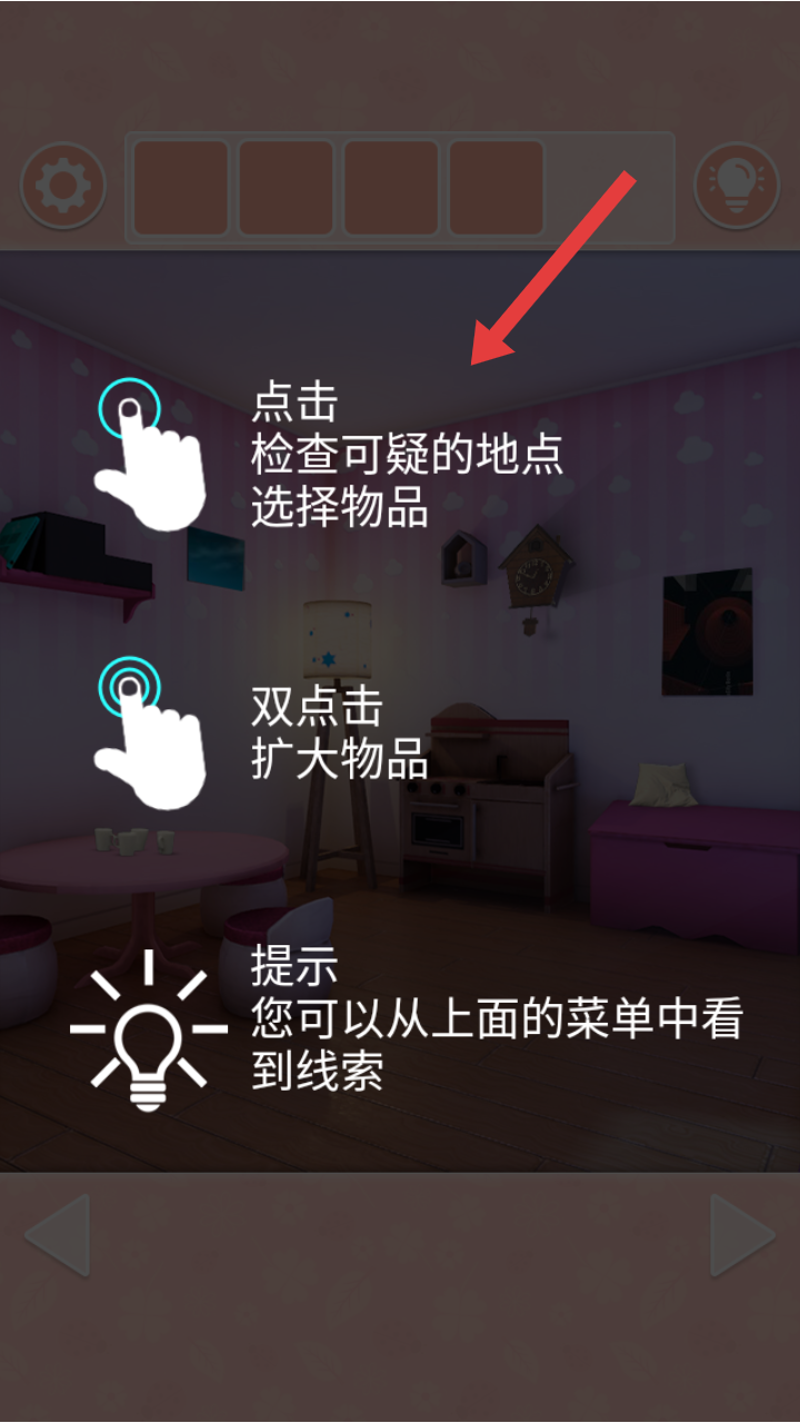 1、跟随教程指引,学习【点击检查可疑地点、选择物品】及【双点击扩大物品】操作,善用上方菜单的提示功能,辅助探索解谜。