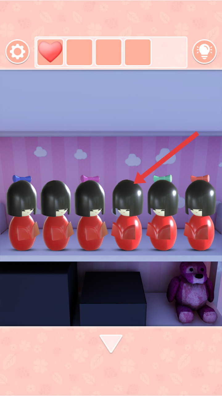 3、观察架子上的人偶,点击中间无蝴蝶结装饰的人偶,获取爱心道具,此道具为关卡解谜关键物品。