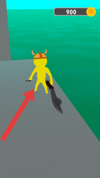 2、黄色火柴人角色戴着维京头盔,手持武器,场景有金币显示(900)、水域等,呈现角色及基础场景设定。