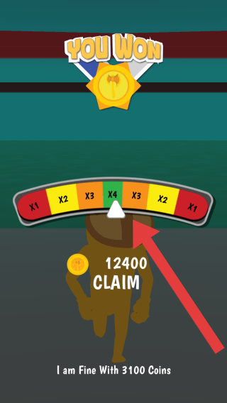 3、显示“YOUWON”(你赢了),有奖励倍数条、可领取金币12400(“CLAIM”按钮),属于闯关获胜后的奖励领取场景。
