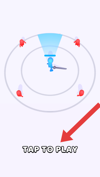 1、画面中有蓝色主角、红色敌人,下方【TAPTOPLAY】提示点击开始游戏,属于典型的点击即玩、围绕角色战斗的开场设计。