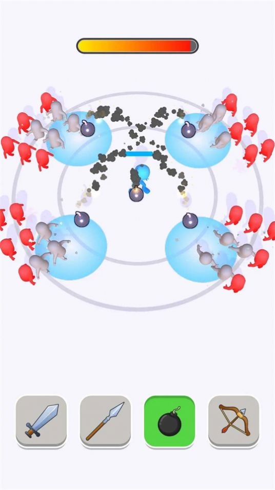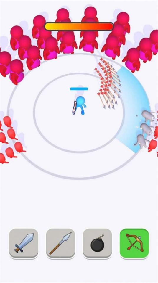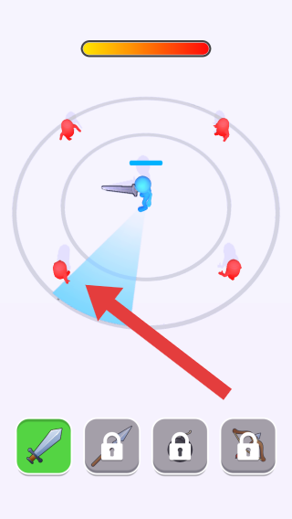 2、蓝色角色持武器,需应对环形轨道上的红色敌人,下方有武器选择栏(含已解锁和锁定武器),属于围绕角色战斗、武器切换的玩法,常见于轻度闯关。
