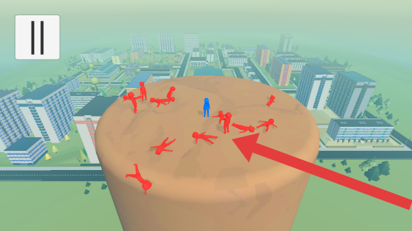 2、实体信息有城市建筑、蓝色和红色小人、暂停按钮(左上角“||”),呈现的是玩家操控蓝色小人在圆形区域与红色小人战斗的场景,属于休闲竞技类画面。