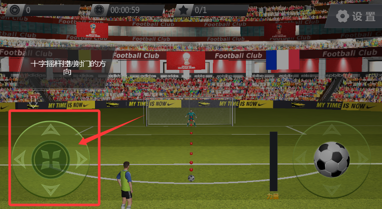 2、通过方向控制键瞄准球门死角,预判守门员站位寻找最佳射门角度。