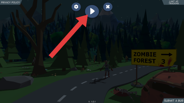 1、界面上有(PRIVACYPOLICY)选项、设置按钮(齿轮图标)、开始游戏按钮(播放图标)、关闭按钮(叉号图标),右下角有提交错误(SUBMITABUG)按钮。