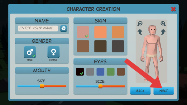 2、角色创建界面,可设置角色姓名(NAME)、性别、肤色、眼睛,还能调整嘴巴(MOUTH)尺寸,设置完点击“NEXT”(下一步)、“BACK”操作,用于创建进入的角色。