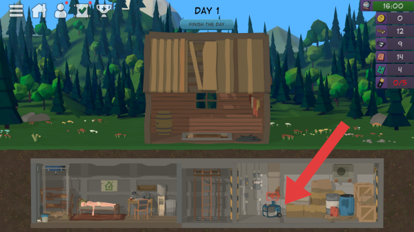 3、显示的是第1天的场景,有房屋、地下空间等场景元素,上方有“FINISHTHEDAY”的提示,属于该生存类角色在特定天数、时间,围绕建筑场景展开进程的界面。