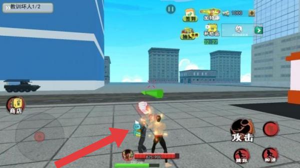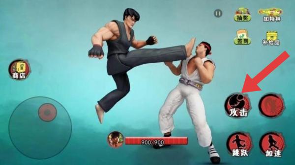 1、画面中两名角色正在对战,左下角是方向控制按钮,右侧有“攻击”“跳跃”“加速”等技能按钮,角色下方显示血量为900/900。