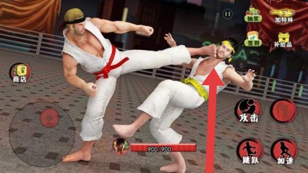 3、画面中两名身着空手道服装的角色正在对战,左侧角色发动踢击动作,左下角是方向控制按钮,右侧有“攻击”“跳跃”“加速”等技能按钮。
