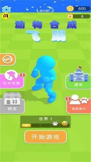 1、画面显示关卡为Level2,金币数量600,有“合并宠物”“建造”“等级提升”等功能按钮,点击【开始游戏】按钮可进入关卡,属于开始前的功能选择和信息展示场景。