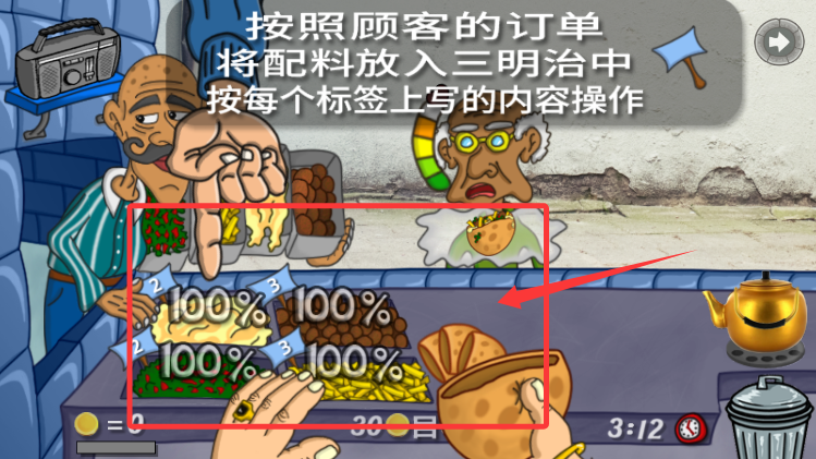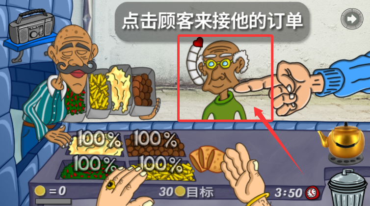 1、开启游戏,按指示需点击前来的顾客,接收其订单的需求。