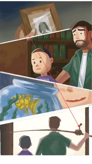 1、浏览剧情插画,了解父子与金鱼的故事,点击进入钓鱼场景开启游戏,沉浸式享受游玩乐趣。