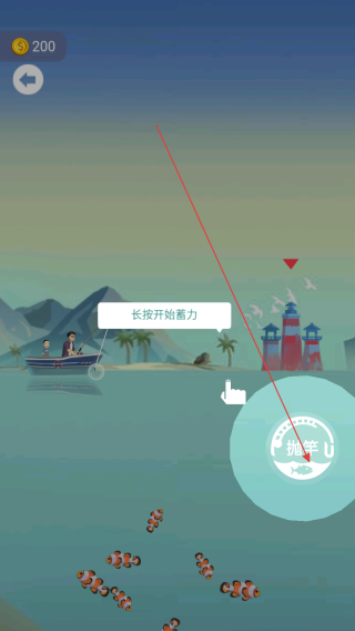 2、长按【抛竿】按钮蓄力,松开将钓线抛出,尽量对准鱼群密集区域,等待鱼咬钩。