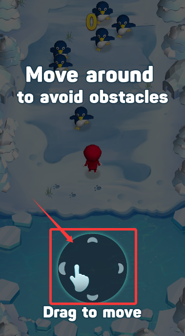 1、进入游戏,通过拖动界面下方圆形操控盘,指引红色小人在冰面场景移动,闪避企鹅障碍。