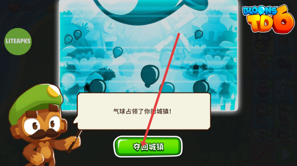 1、点击主界面【开始】,遇到“气球占领城镇”剧情提示,选择【夺回城镇】,开启塔防挑战关卡。