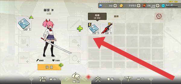 2、进入【角色】页面,使用金币点击【升级】提升角色属性,装备栏有空就配备武器(比如长刀)、饰品,增强攻击和防御能力。
