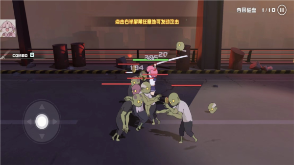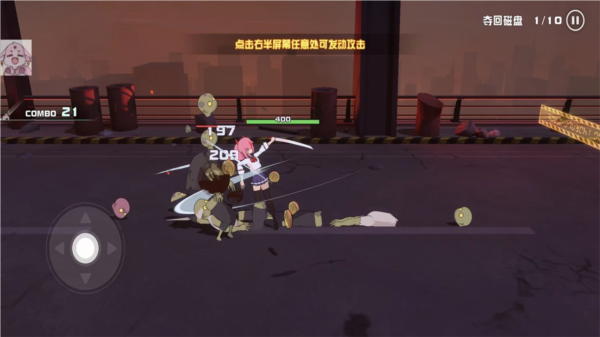 1、战斗时,左手操控移动摇杆,右手点击攻击键打出连招,关注COMBO数提升伤害,碰到精英怪(血条带绿条)优先集中火力攻击。