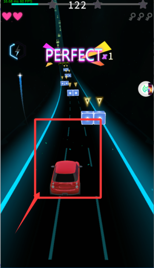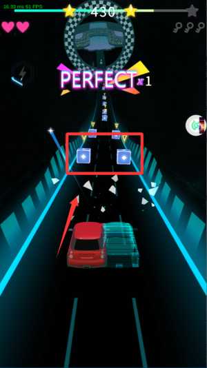 2、注意赛道上的音符方块,按照背景音乐的节拍撞击它们,连续精准操作可以积累连击奖励分数,同时解锁更多赛车技能。