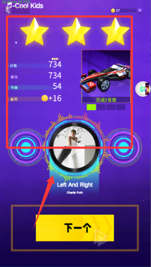 1、进入游戏后先选择单人挑战模式,熟悉基础操作与音乐节奏的配合,通过点击屏幕控制赛车左右移动避开障碍物。