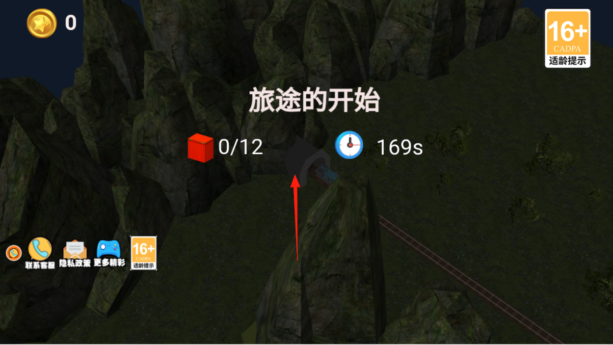 1、在初始界面,按箭头指向进入隧道,开始运输任务,需在169s内收集12个货物。
