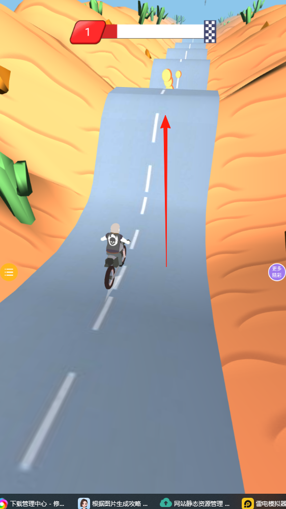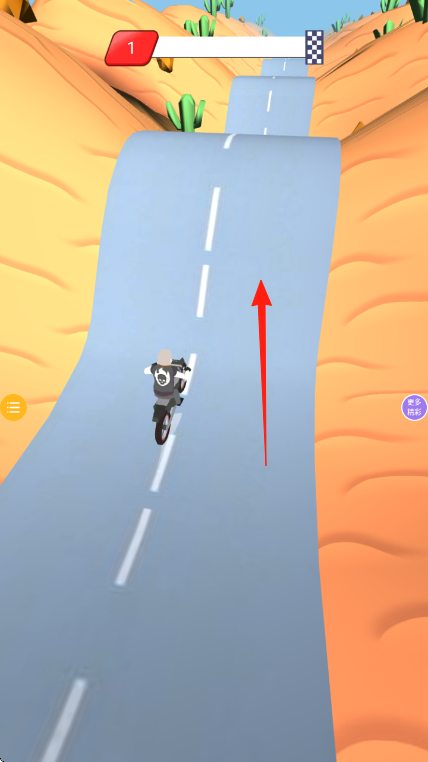 1、进入沙漠赛道,操控角色沿箭头指向的坡道骑行,开始爬坡挑战。